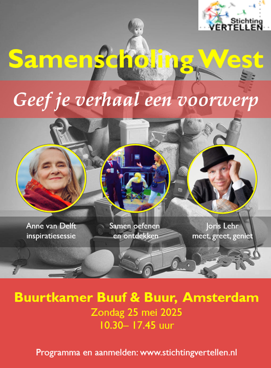Op zondag 25 mei 2025 kwamen 26 vertellers bij elkaar in buurtcentrum Buuf & Buur in Amsterdam-Noord om met elkaar te ‘samenscholen’. Thema van de dag was ‘Geef je verhaal een voorwerp’: hoe verrijken attributen je vertelling? We kijken terug op een geslaagde ontmoeting tussen gedreven vertellers.